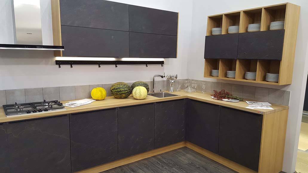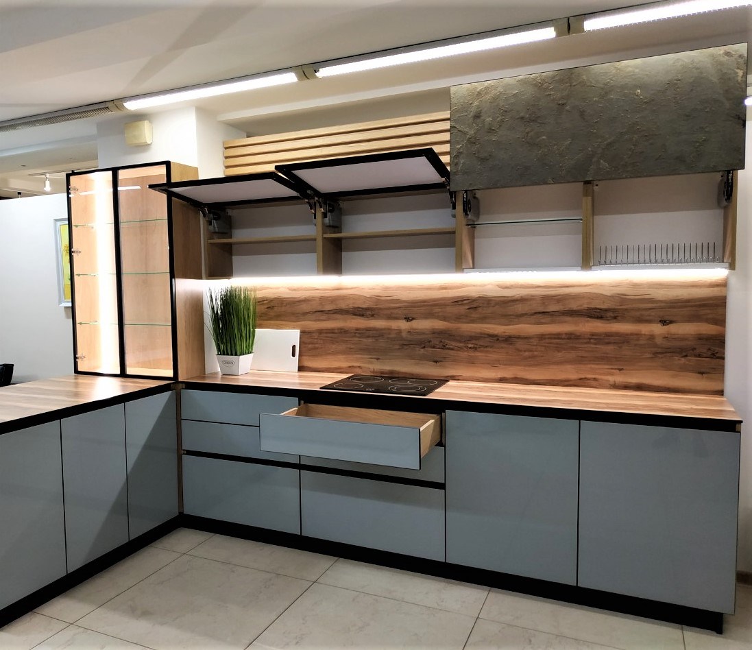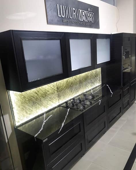 Один из самых популярных видов фасадов мебели – это фасады с накаткой HPL пластика. Множество декоров пластиков позволяет создать кухню либо корпусную мебель по достаточно демократичной стоимости, которая будет конкурировать с дорогой авторской мебелью (в сравнении с фасадами из натурального дерева, крашеными фасадами, эмалевыми фасадами и т.д.). А огромнейший вид кромок позволит поэкспериментировать с цветом, создавать дверцы с торцами, цвет которых будет отличаться от основного цвета полотна фасада, и добавит элемент уникальности в общую концепцию мебели (ссылка на раздел кромок). Поверхность HPL пластика может иметь глянцевую или матовую поверхность и быть выполнена в разнообразных расцветках — от ярких однотонных декоров до фантазийных декоров под «золото» или «серебро», имитация экзотических пород дерева и камня.